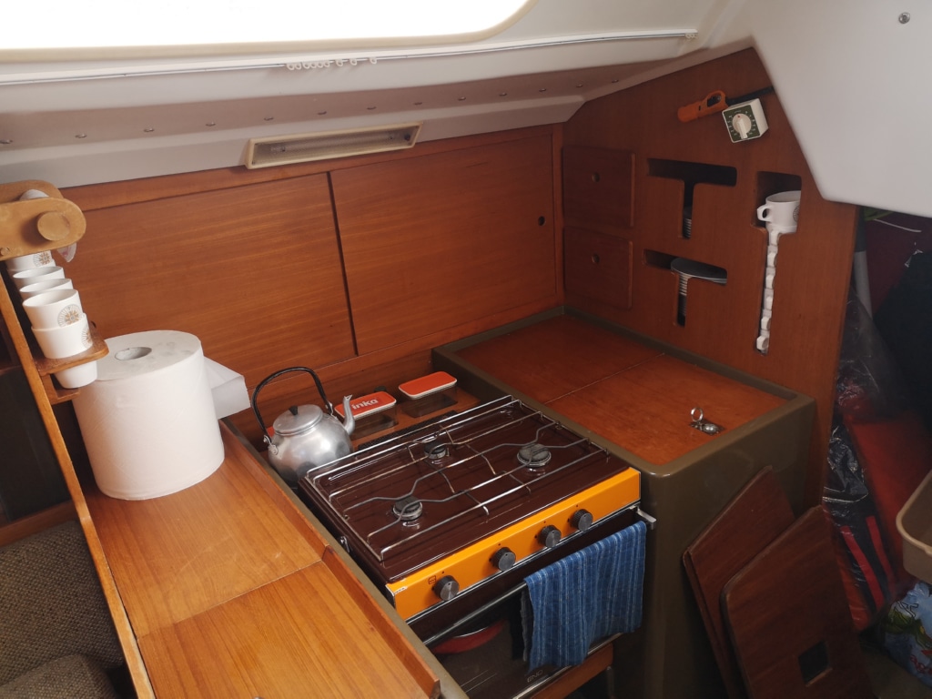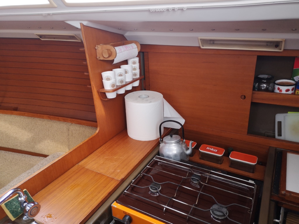 W kambuzie mamy sporą lodówkę, kuchenkę z piekarnikiem, podwójny zlew