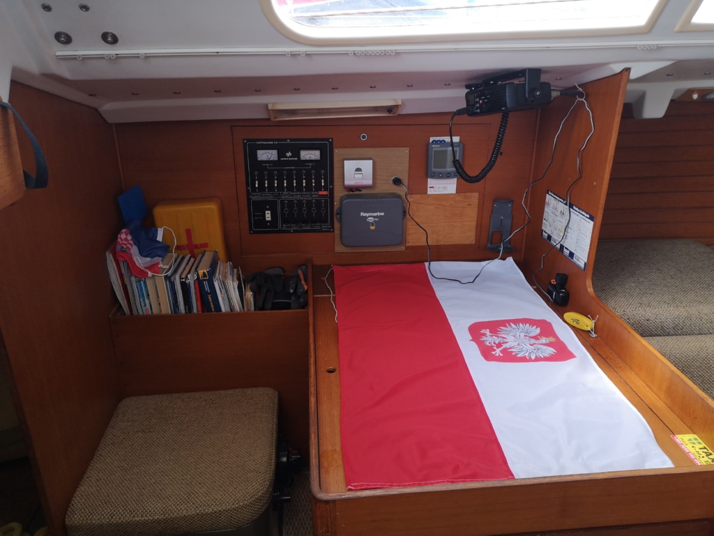 Jacht wyposażony jest w tratwę ratunkową, radio VHF z DSC, plotter wraz z AIS, sondę, autopilot, sondę EPIRB.